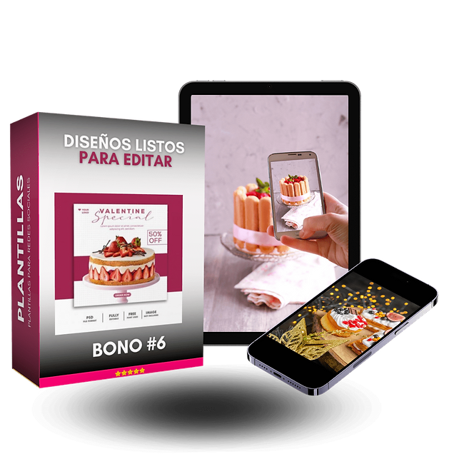 Además te ofrecemos una sorpresa adicional: un “kit de diseños editables en Canva”. Este bono te proporcionará plantillas profesionales y totalmente personalizables para tus imágenes de postres en redes sociales.